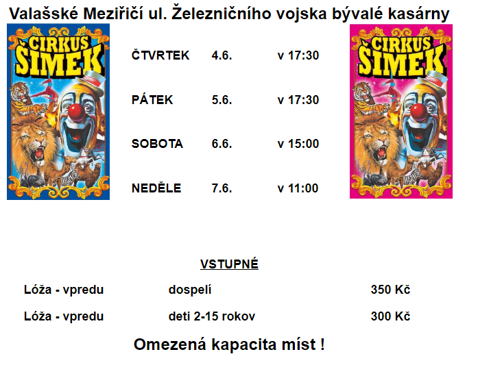 V týdnu od čtvrtka 4. června do neděle 7. června bude cirkus Šimek hostovat ve Valašském Meziříčí.