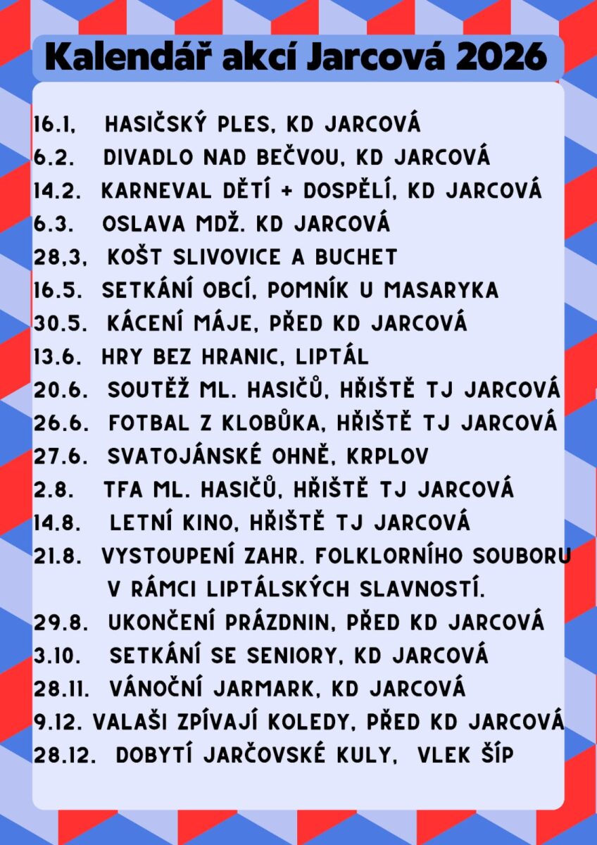 Kalendář akcí obce Jarcová na rok 2026.