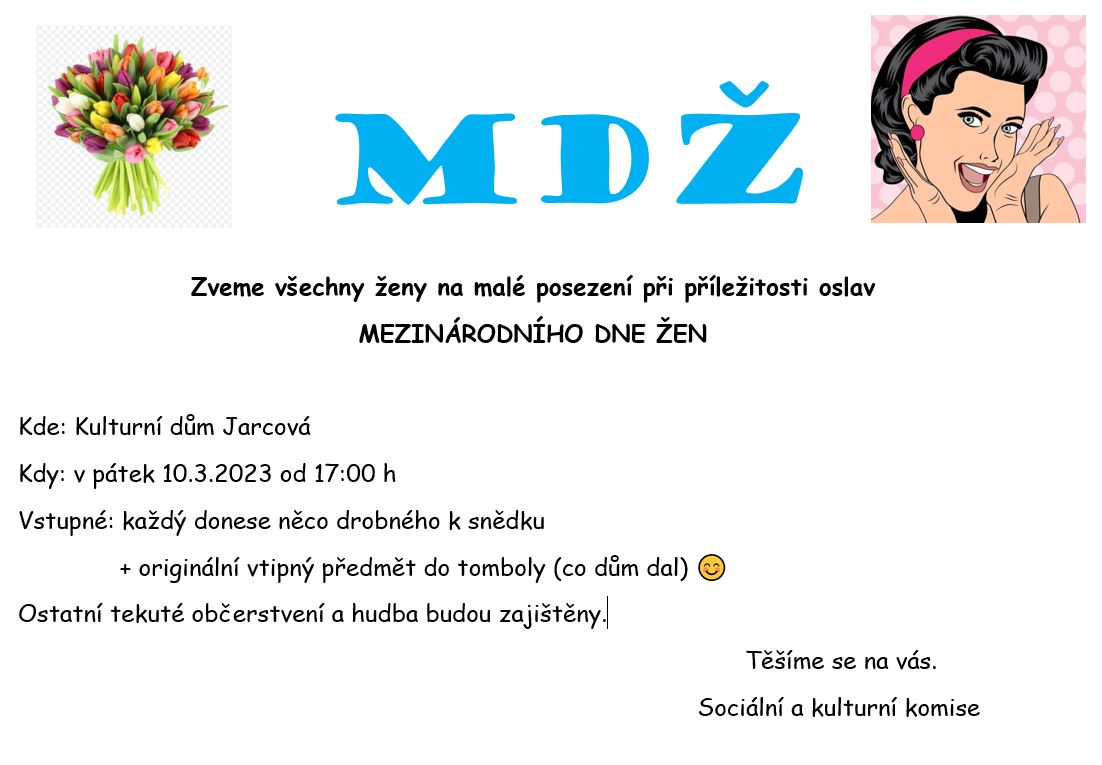 Sociální a kulturní komise zve všechny ženy na oslavu MDŽ, více informací na přiloženém plakátku ...