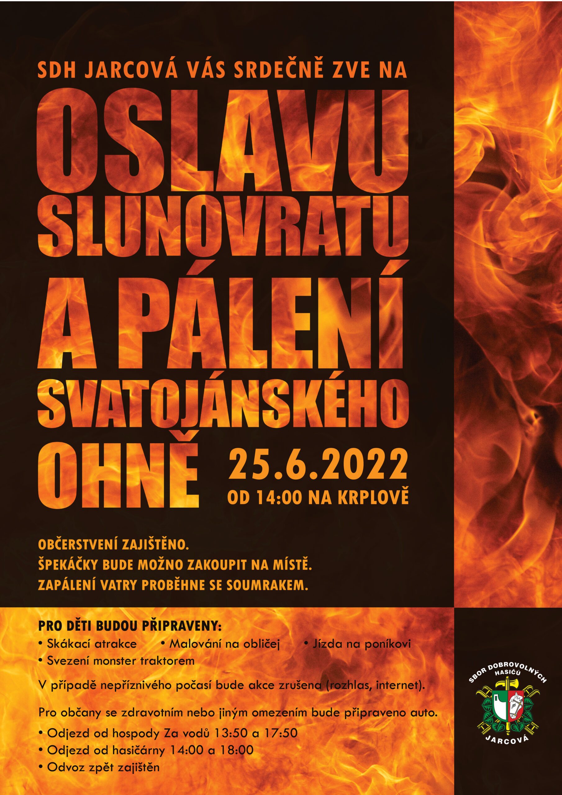 SDH Jarcová Vás srdečně zve na "Oslavu slunovratu a pálení svatojánského ohně" v sobotu 25.6.2022 od 14 h na Krplově. Více informací v přiloženém plakátu ...