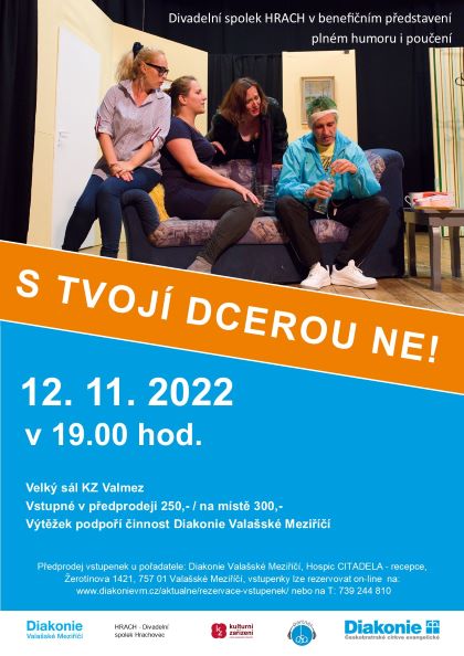 Divadelní hru „S tvojí dcerou ne!“ nastudovali ochotníci podle stejnojmenné hry Antonína Procházky. Pojednává o tom, jak snadné je spadnout do manželské krize a jak těžké je vyjít z ní ven.  Pověstný zápal herců z Hrachovce, které režíruje Dagmar Kladošová, slibuje neotřelou podívanou plnou humoru i poučení!