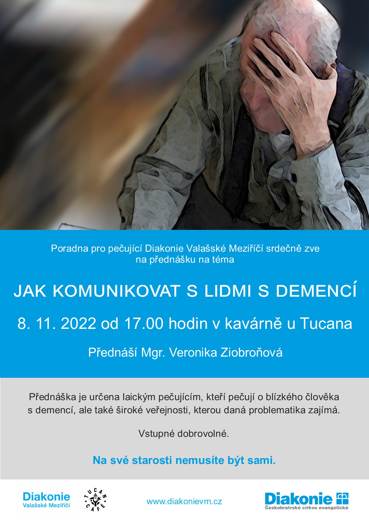 Poradna pro pečující zároveň zve na přednášku na téma Jak komunikovat s lidmi s demencí, která se uskuteční 8.11.2022 v 17:00 hodin v kavárně u Tucana ve Valašském Meziříčí. Přednáška je určena laickým pečujícím, kteří pečují o blízkého člověka s demencí, ale také široké veřejnosti, kterou daná problematika zajímá. Letáček přikládáme v příloze.