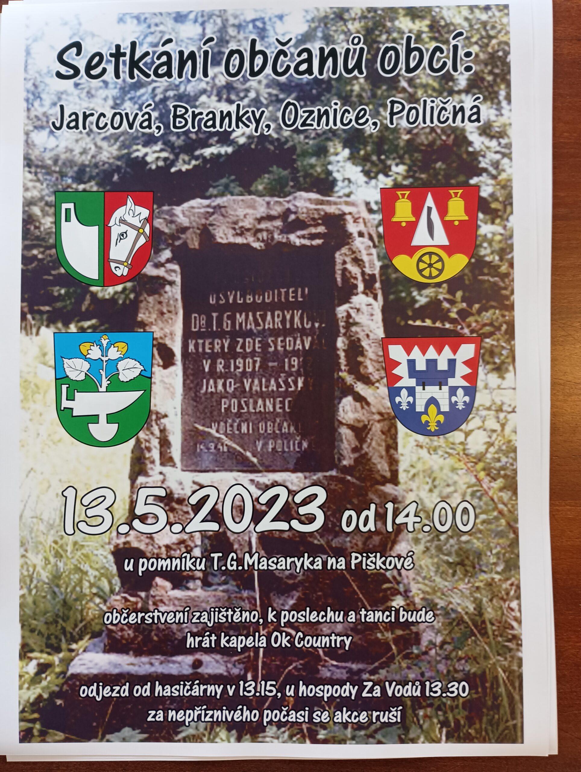 Prosím, přijměte pozvání na tradiční meziobecní setkání občanů obcí Jarcová, Poličná, Oznice a Branky, které se uskuteční u pomníku TGM na Piškové v sobotu 13.5.2023 od 14 hod - viz příloha. Bohaté občerstvení zajištěno.