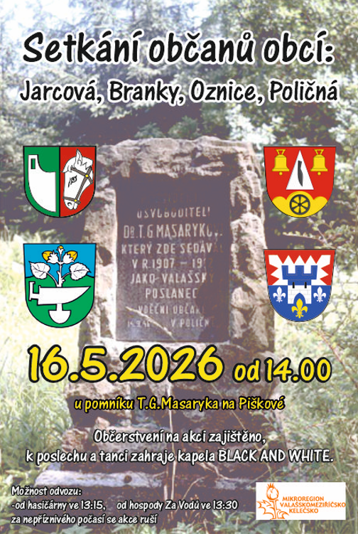 Zveme všechny občany na tradiční setkání obcí Jarcová, Branky, Oznice a Poličná u pomníku T. G. Masaryka na Piškové.
