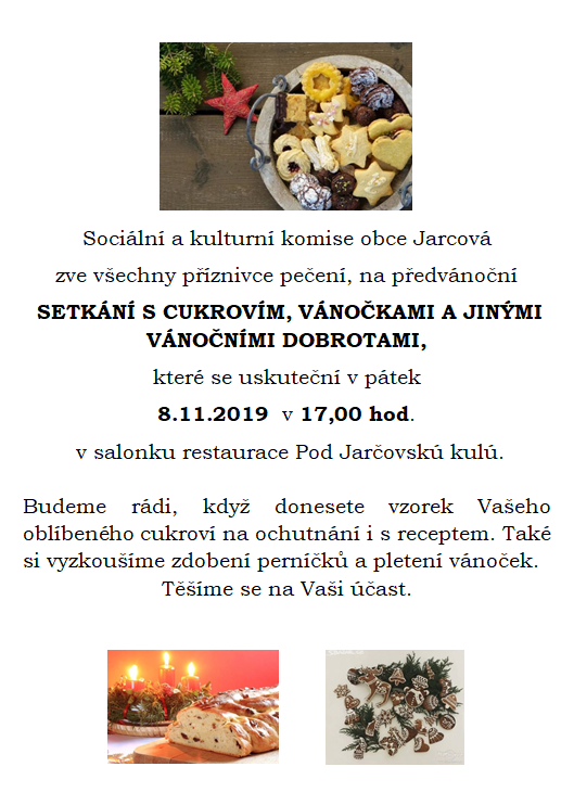 Sociální a kulturní komise obce Jarcová zve všechny příznivce pečení na "Setkání s cukrovím, vánočkami a jinými vánočními dobrotami"...
