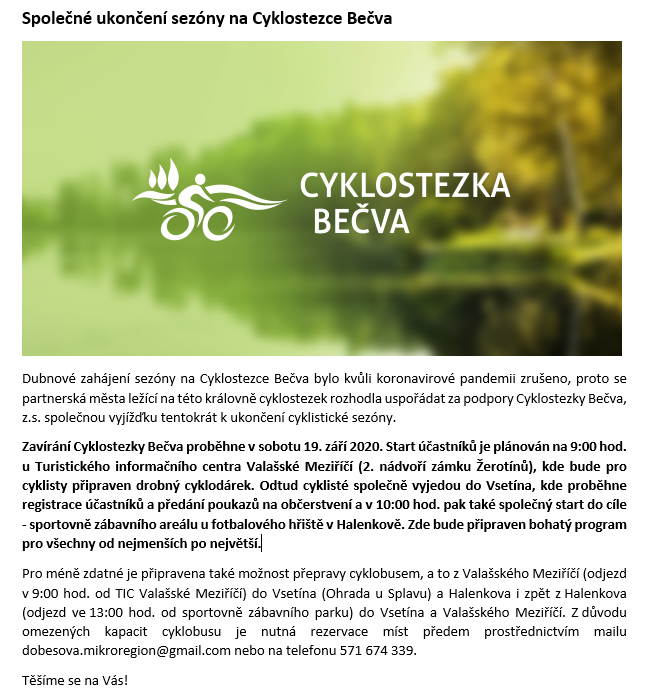 V příloze pozvánka na ukončení sezóny na Cyklostezce Bečva..