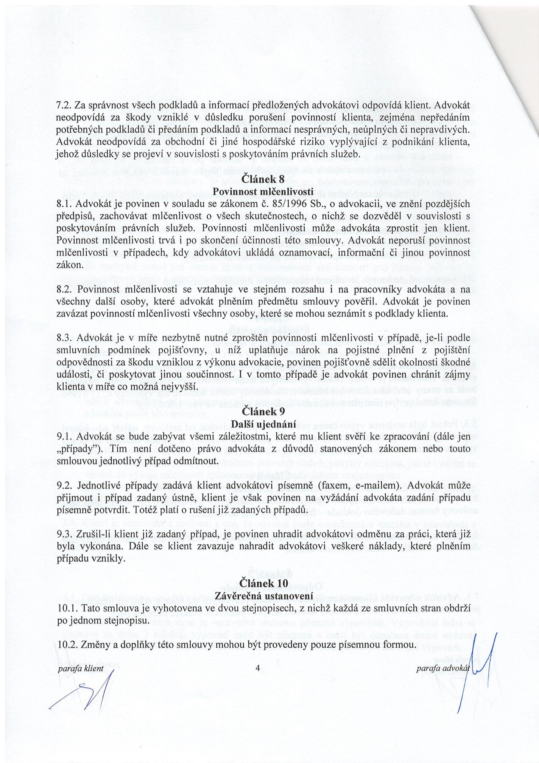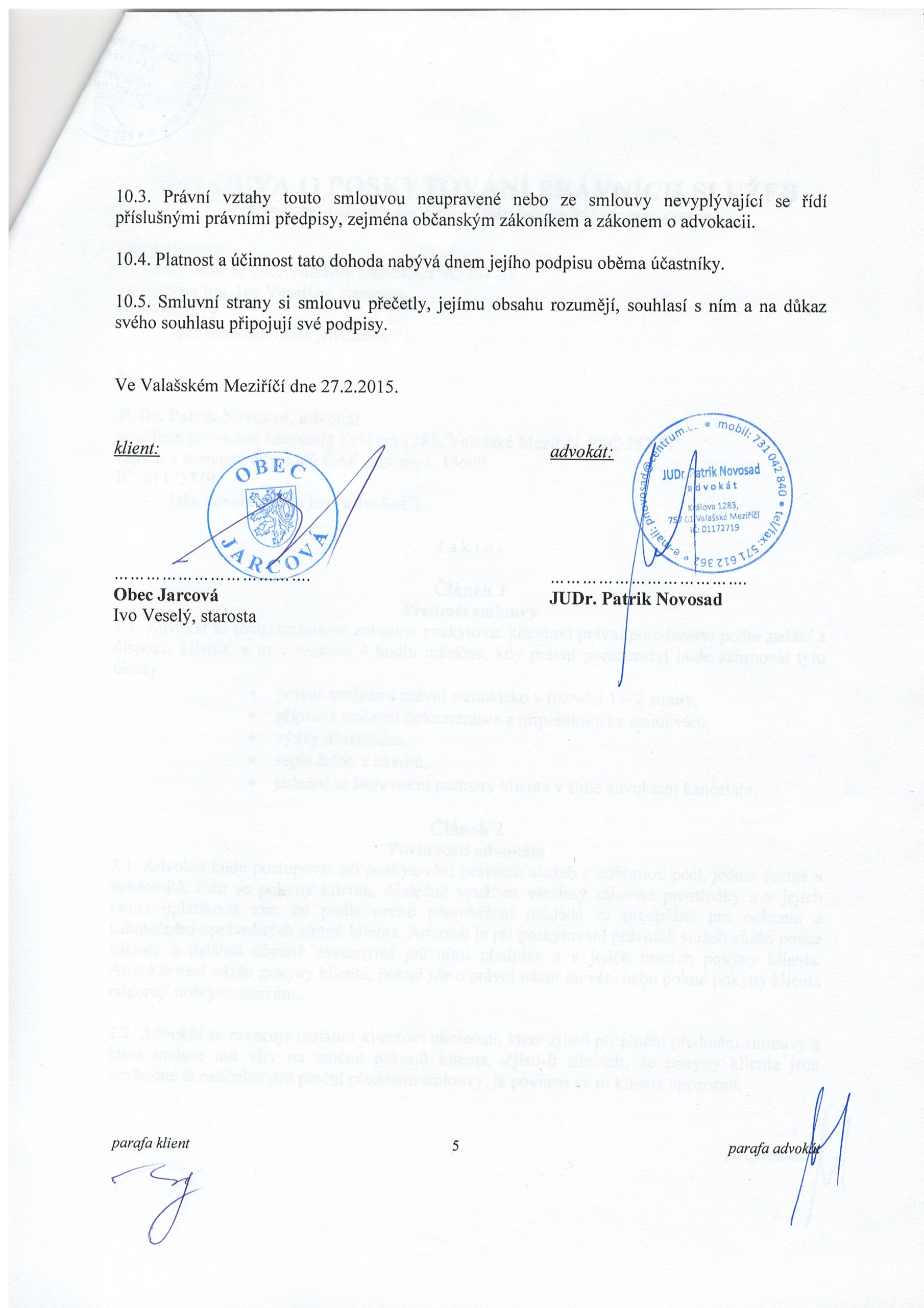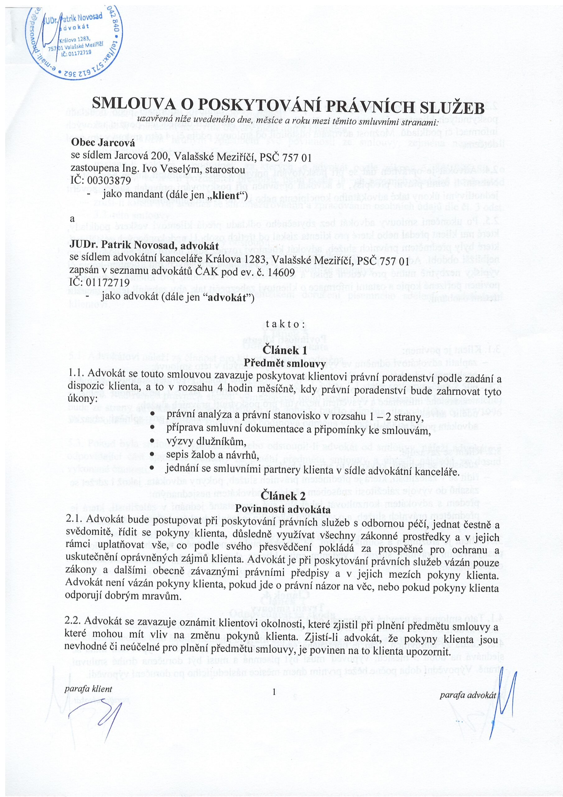 1. Měla v období od 1. 1. 2020 do 5. 9. 2023 uzavřenou obec Jarcová nějakou smlouvu s advokátem či advokátní kanceláří (ať už písemnou, nebo ústní)? V případě, že ano, prosím o zaslání scanu písemných smluv, popř. u ústně uzavřených smluv o jejich popis.
