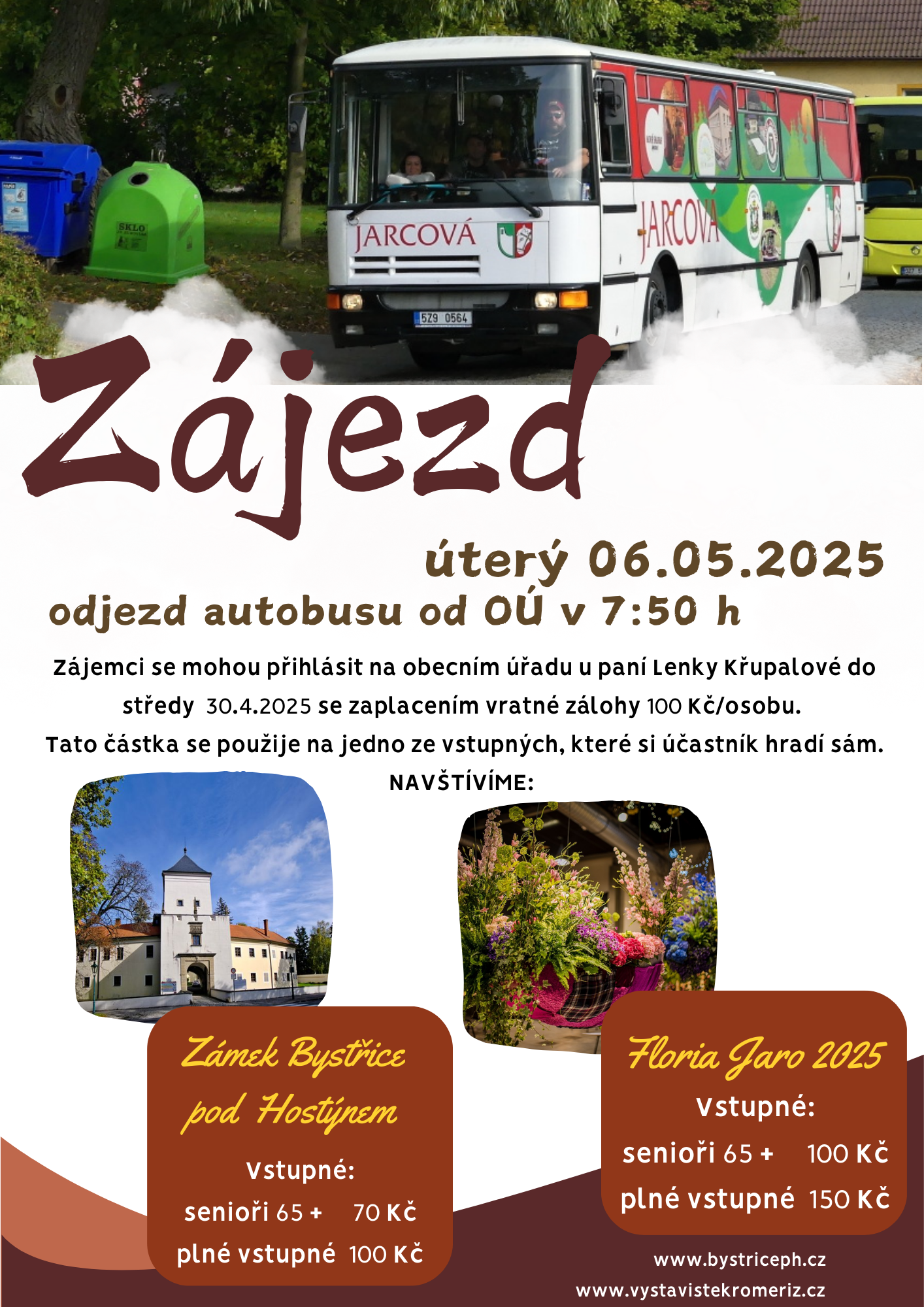 Zájezd se uskuteční v úterý 6.5.2025. Hlásit se můžete u paní Křupalové na obecním úřadu do 30.4.2025.