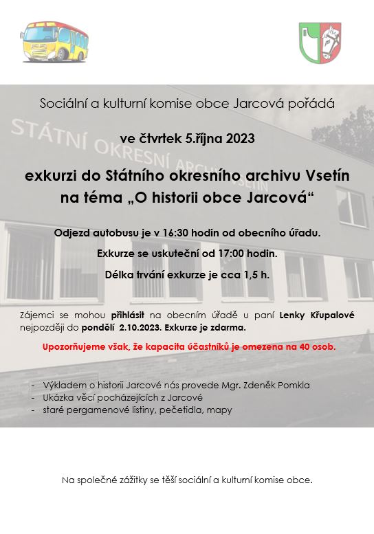 Sociální a kulturní komise Vás zve na návštěvu archivu ve Vsetíně, besedu na téma "O historii Jarcové".