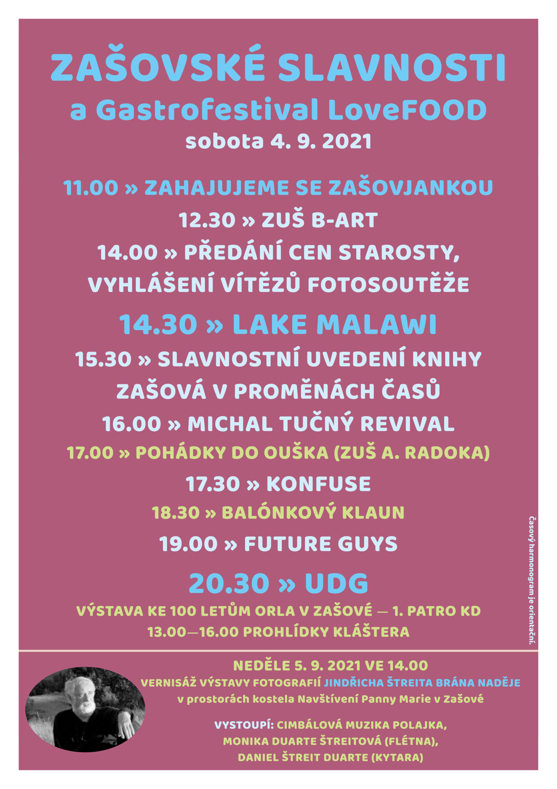 V sobotu, v rámci slavností bude slavnostně pokřtěna kniha Zašová v proměnách časů a v neděli proběhne vernisáž výstavy fotografií Jindřicha Štreita z jeho cyklu Brána naděje v kostele Navštívení P. Marie.